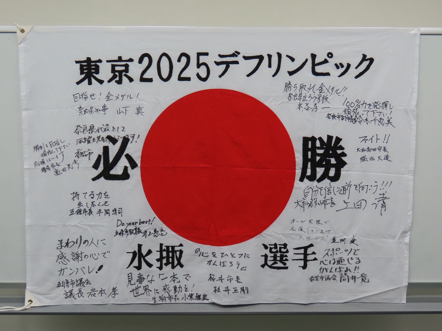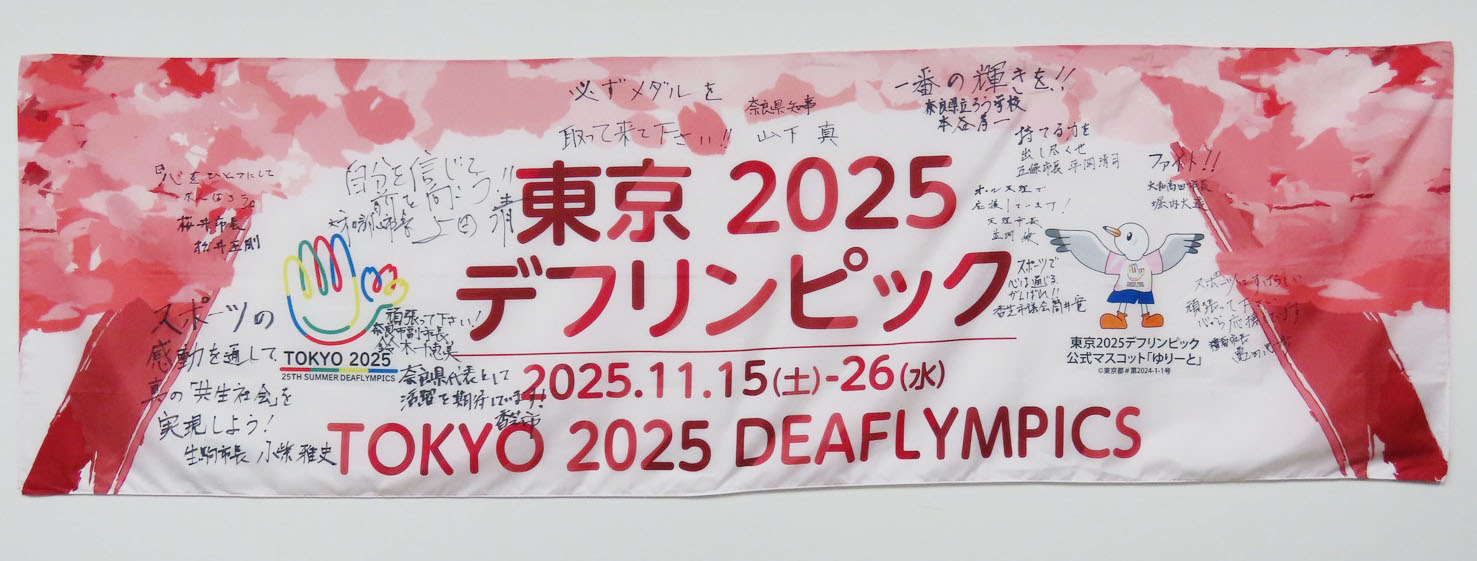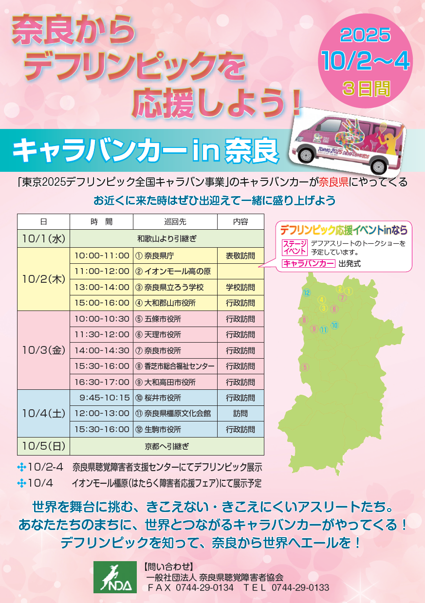 ・出場選手 ・キャラバンカー巡回写真集 ├2025/10/01(水)和歌山から奈良へ引き継ぎ ├2025/10/02(木)奈良県庁、高の原イオン、大和郡山 ├2025/10/03(金)五條、天理、奈良、香芝、大和高田 ├2025/10/04(土)桜井、橿原、生駒 ├2025/10/05(日)近畿ろうあ者大会会場にて京都へ引き継ぎ └その他:メダルのレプリカ、応援メッセージ ・奈良からデフリンピックを応援しよう!キャラバンカーin奈良 ・デフリンピック応援イベントinなら